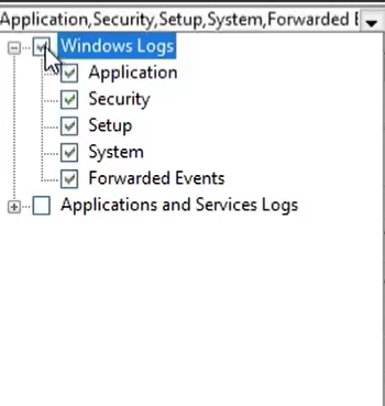 - Then the By log option under Event Logs select the Windows logs to collect: