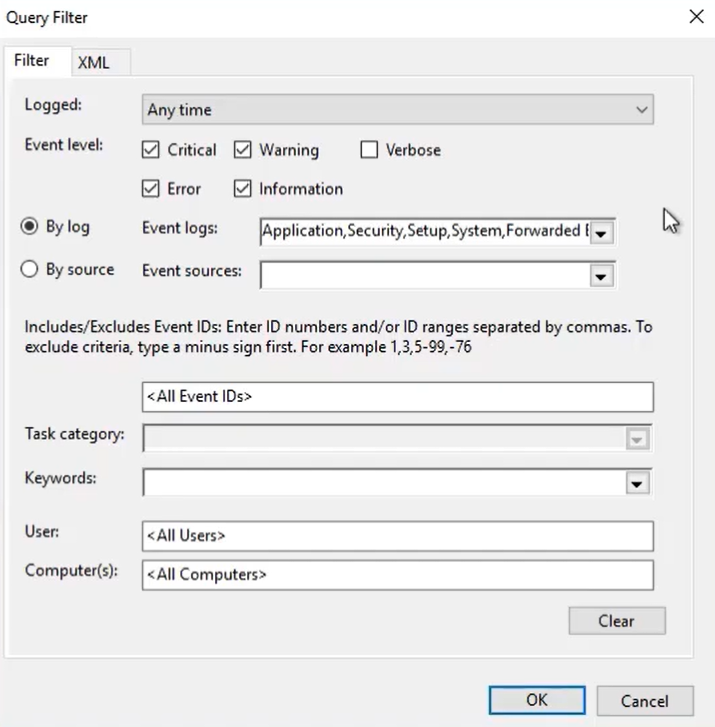 - In the opened Query Filter dialog select the event levels to collect: