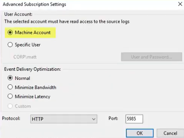 - Click on the Advanced… button and in the opened dialog choose the proper user account that must have read access to the source logs, by default it will be Machine Account.