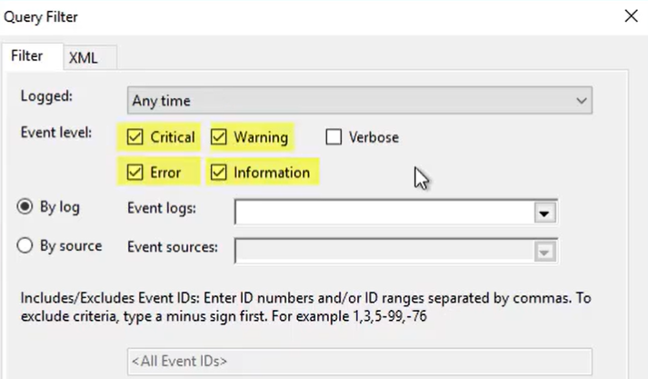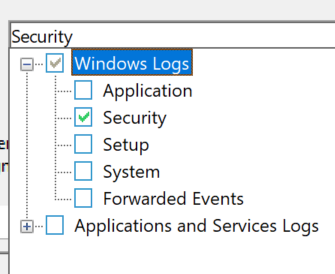 - Then the By log option under Event Logs select the Windows logs to collect, for example, start with: