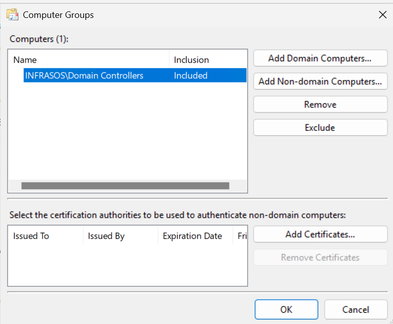 - Click on Add Domain Computers and select the Domain Controllers group. Click Ok