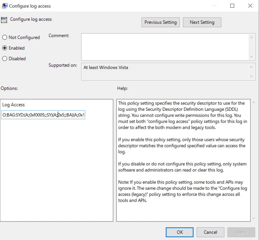 Computer Configuration → Administrative Templates → Windows Components → Event Log Service → Security → Configure log access